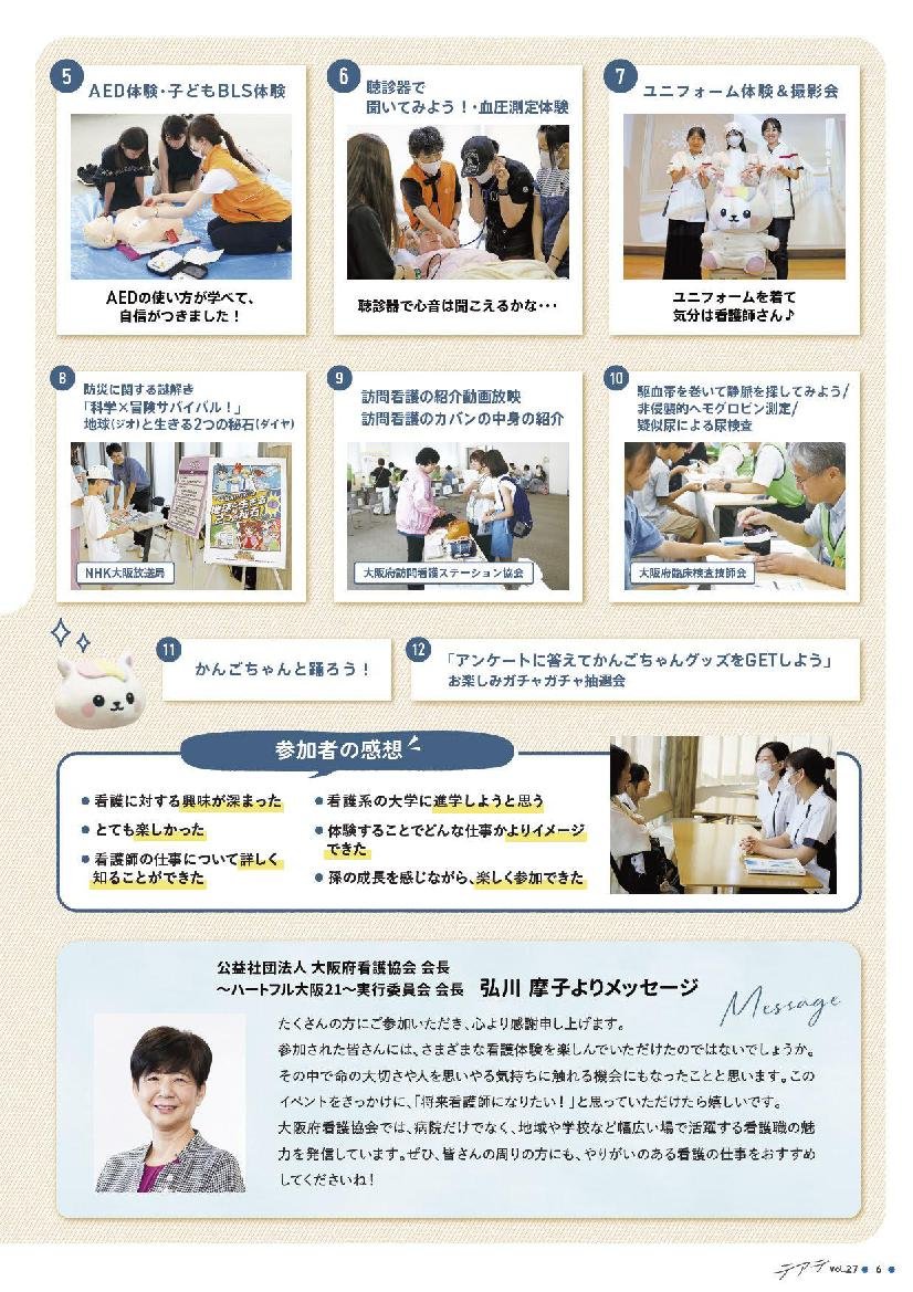 大阪府では毎年、各種団体および行政からなる「看護の日~ハートフル大阪21~実行委員会」が主催したイベントを開催し、府民一人ひとりが看護や介護について理解を深める機会としています。